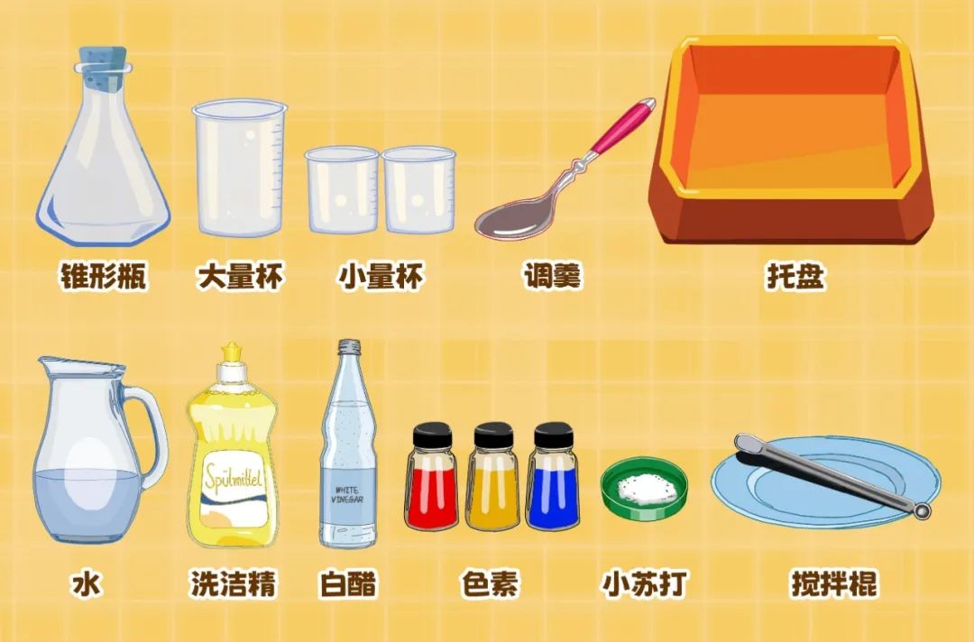 用色素将量杯中的白醋染成孩子喜欢的颜色。