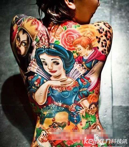 许多儿童都喜爱迪斯尼动画片中的白雪公主,但其中多数人都伴随着成长而逐渐淡忘了。台湾台中市27岁的女子Annfaye Kao却一直喜爱着白雪公主,甚至她将白雪公主和七个小矮人的故事场景完全绘制在自己的后背上。