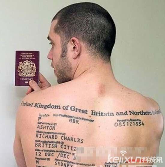 这是ID纹身吗?是的!来自英国的理查德-阿什顿总是随身带着护照。事实上,他将自己的护照内容全部纹绘在自己后背。今年27岁的阿什顿是来自伦敦旺兹沃思市的一位私人教练,他在后背纹绘自己的护照是为了纪念2005年徒步旅行澳大利亚。