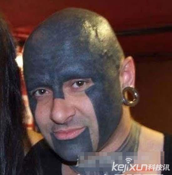 图中所示的男子将头部纹上了黑色,半个面部也纹上了黑色,是想成为蝙蝠侠么?这可能是最偏激的面部纹身之一。