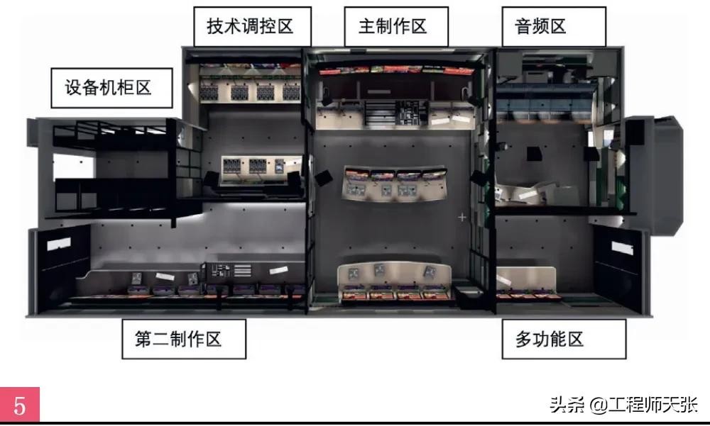 国内目前也在开发建设此类转播车,采用国产半挂车底盘,箱体采用内外套双侧拉结构。转播车内部划分为主制作区、第二制作区、音频区、多功能区、技术调控区和设备机柜区,设计了36个工位,其中主制作区14个、第二制作区8个,每个制作区都可以进行8K或4K节目制作,也可以进行传统4K分区制作,互不干扰,一切都是为了播出安全。