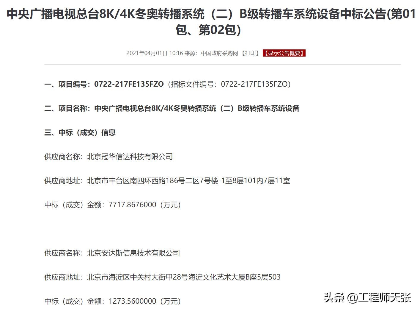 经核实中央广播电视总台为2022年北京冬奥会准备的8K/4K冬奥转播系统B级转播车内主要设备金额约9000万元。