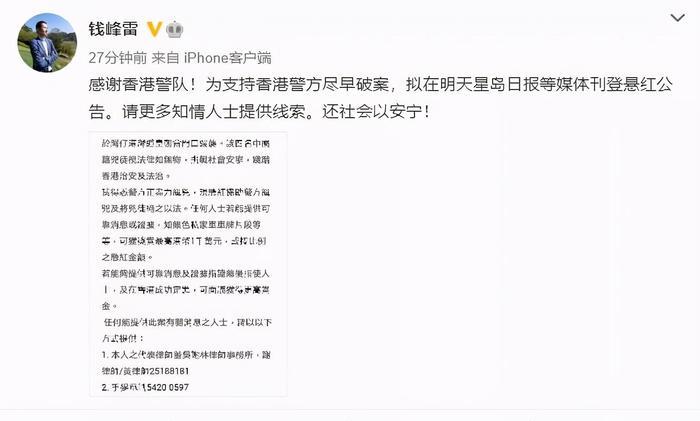 钱峰雷为尽速将凶徒绳之于法,悬赏1000万港元追缉4名凶徒。他在微博贴出16日在《星岛日报》刊登的声明,表示该4名凶徒视法律如无物,挑战社会安宁,践踏香港治安及法治。得悉警方正尽力缉凶,现悬红协助警方缉凶及将凶徒绳之以法。任何人士若能提供可靠消息或证据,如银色私家车车牌片段等等,可获奖赏最高1000万港元,或按比例之悬红金额。