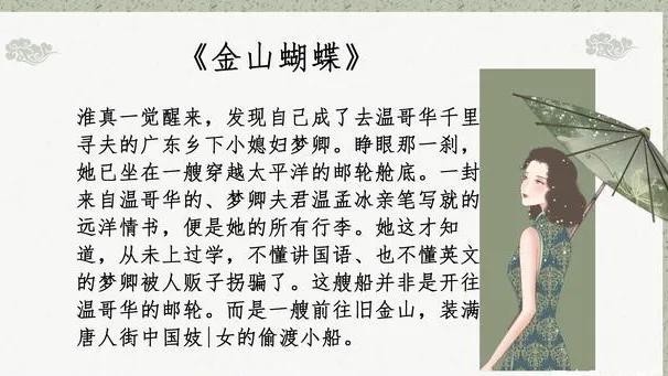 书评:女主穿越、民国题材。大二学生淮真死于利亚难民之手后,时光回溯近百年,她成为了一个叫做梦卿的广东新妇,本要去温哥华寻新婚夫婿,却被拐子骗上这艘开往金山的船。在船上,淮真与白人西泽狭路相逢,西泽有严重排华思想,他对淮真态度强硬,并不友好。