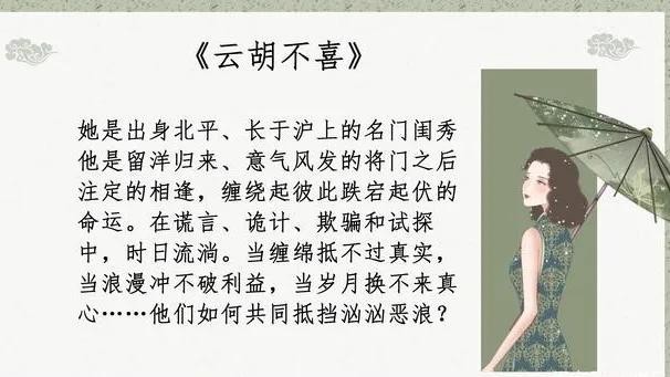 婚后,随着接触的加深,陶骧与程静漪慢慢生出了感情。可越在乎就越会在意,陶骧会怀疑静漪的忠诚,他不惜亲自设下陷阱来验证。而程静漪则习惯将心事埋在心底,两人缺少沟通,距离越来越远……说到民国文,《云胡不喜》必须拥有姓名!男主陶骧真的是梦中情人!最爱男主没有之一!满分推荐!