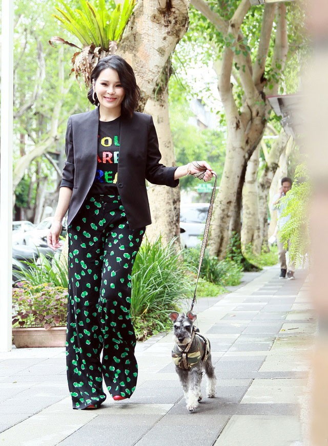 没事的时候遛遛小狗,即便是遛小狗,也是要精致打扮一番的,黑色的T恤点缀了字母logo,显得更加潮流些,下半身搭配黑色底的绿色印花阔腿裤,高腰的剪裁显得干练不少,另外搭配黑色的短款小西装味,微卷的短发,女人味十足,另外周惠还利用了一点小心机,选择了红色的鞋子,露出点点红色,也会深色的穿搭增添一点艳丽感。#一起等春天#