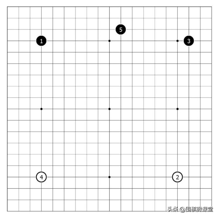 如图5,黑棋1、3、5的布局就是中国流布局。黑5没有选择守角,而是在边上连片,3颗棋子有机联系形成一个作战整体。