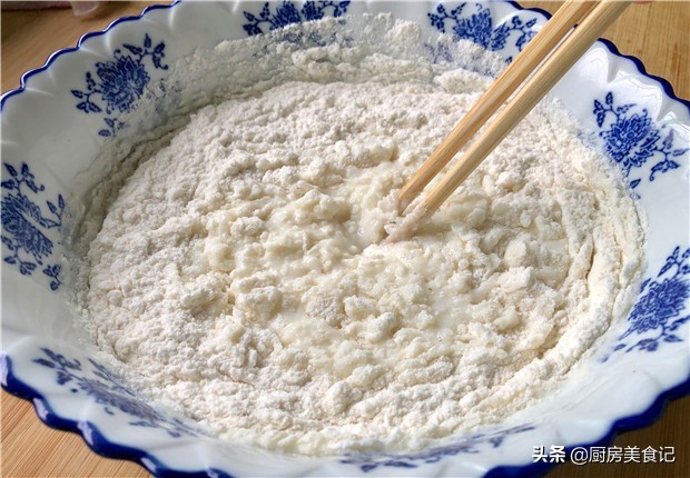 (4)、准备适量大米面粉,将大米面粉加入到碗中,和山药一同搅拌均匀,将山药泥给搅拌得粘稠一些,将其制作成山药面糊。在对面糊进行准备的时候,面糊不要将其弄得太干,用筷子挑起面糊,面糊能有稍微的丝状出现时即可。如果面糊太稀、太干的话,都会影响到山药发糕的制作。