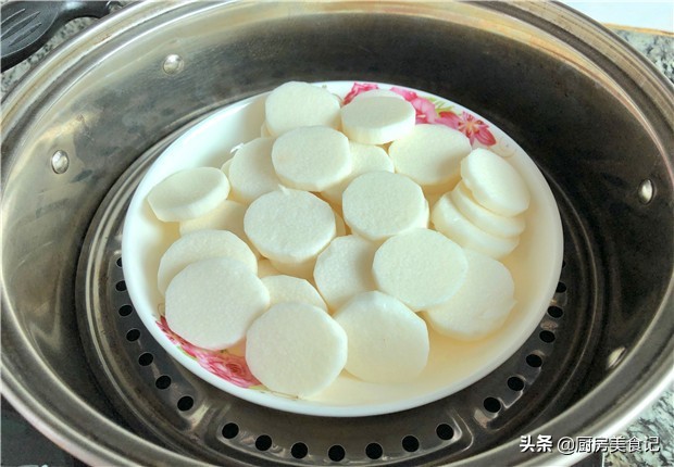 (2)、切好的山药,我们要把山药装入盘中。然后准备一个蒸锅,并把山药放入蒸锅当中,再开大火对山药进行蒸制半个小时,把山药给完全蒸熟。在蒸山药的时候,尽量多蒸上一小会,能让山药变得更软糯。