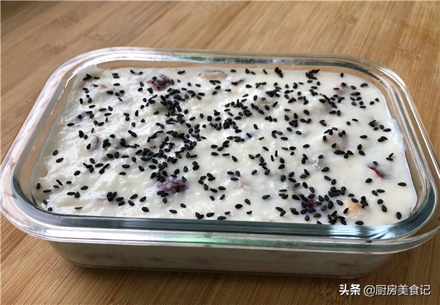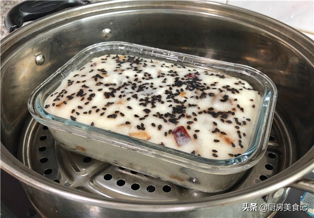 (6)、把准备好的面糊,全部倒入模具中,并用铲子将其整理平整。接着往其表面,再撒上一些黑芝麻以后,就可以把制作好的面糊,放入蒸锅当中,并开大火对其蒸制20分钟。全程要采用大火蒸制,一定要牢牢盖紧锅盖,以防发糕走气。