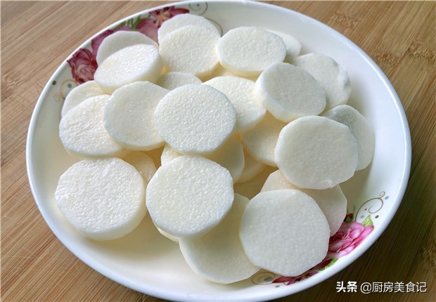 (1)、首先我们要准备适量的新鲜山药,在对山药进行购买的时候,尽量选择汁水丰富一点的山药。买回来的山药,我们把山药削皮以后,并将山药改切成薄片状备用。在对山药进行削皮的时候,记得往手上抹上一些白醋,因为山药外皮,会让你的皮肤瘙痒,抹适量白醋以后就不会了。