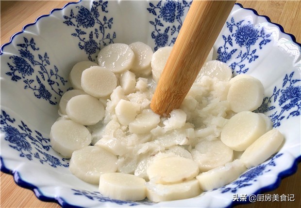 (3)、蒸熟以后的山药,我们要把山药从蒸锅中取出,然后用擀面杖,将山药给擀碎成山药泥。碾碎以后的山药,我们要往山药中加入适量牛奶,再加入适量白糖。牛奶和白糖的加入,需要根据山药的比例去进行调和,尽量把山药给和的稀一些。喜欢吃甜一点的朋友,可以多放一些白糖。