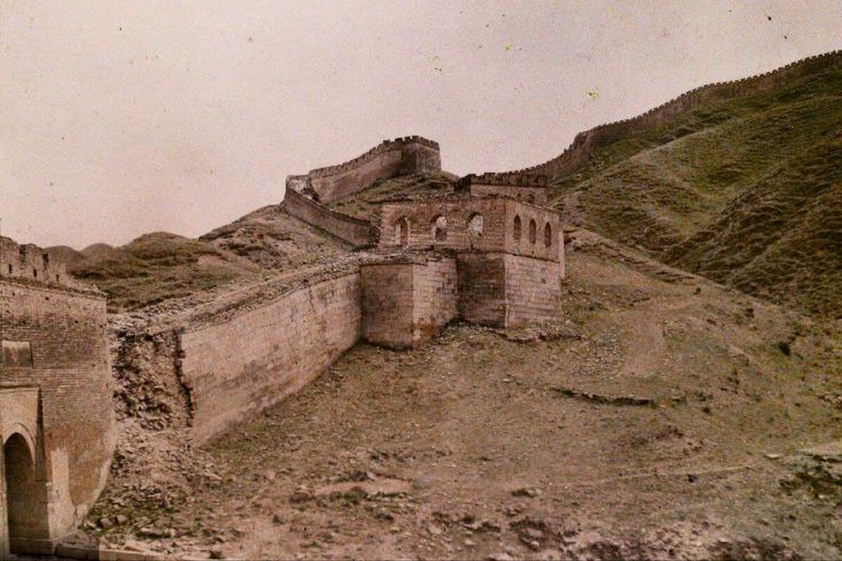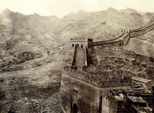 照片拍摄于1872年,摄影师是英国工程师蔡尔德。他在前往蒙古的旅途上,记录下来当时长城雄伟壮丽的景象。不过,由于山上草木稀疏缺乏生机,给人的感觉同样是荒凉破败,象征着清朝末期的衰落。