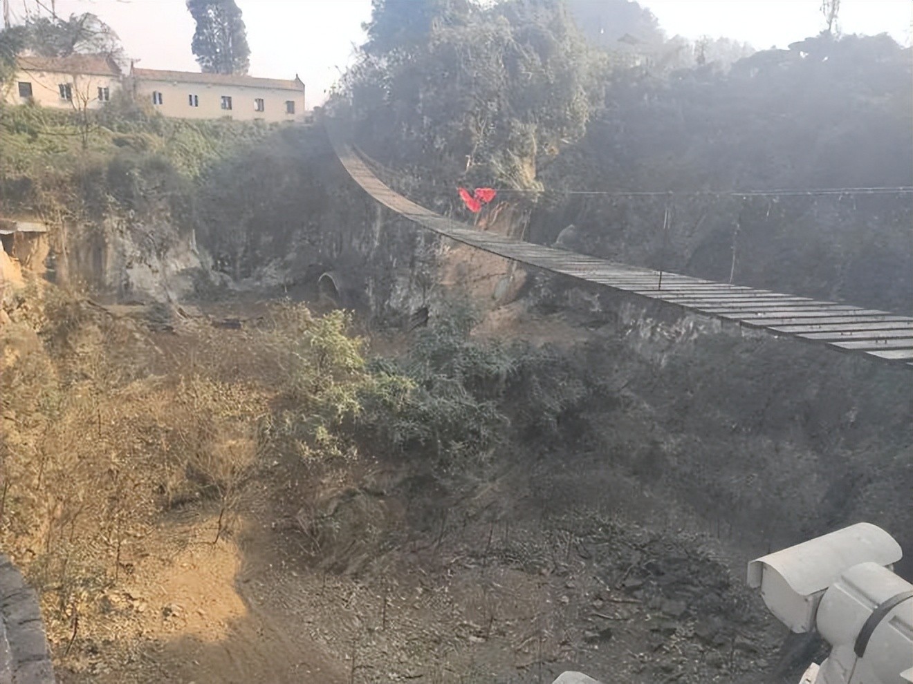 令人猝不及防的是,在这里居然还有一座吊桥,连通着城堡围墙大门,与跨过一个十来米深的深坑外的山头相通。这座深坑之上的吊桥,由于年代已久荒弃太长时间,可能没有几个人有胆量走在上面了。