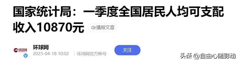 据国家统计局数据显示,2023年一季度全国人均可支配收入为10870元。