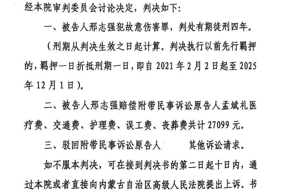 判决书显示,被告人邢志强犯故意伤害罪,判处有期徒刑4年,赔偿死者孟永清父亲孟 斌礼各项费用共计2万余元。此次判决与一审有较大差别,2023年8月25日,邢志强曾被乌兰察布市中级人民法院以故意杀人罪判处无期徒刑,赔偿死者父亲孟斌礼丧 葬费4万余元。