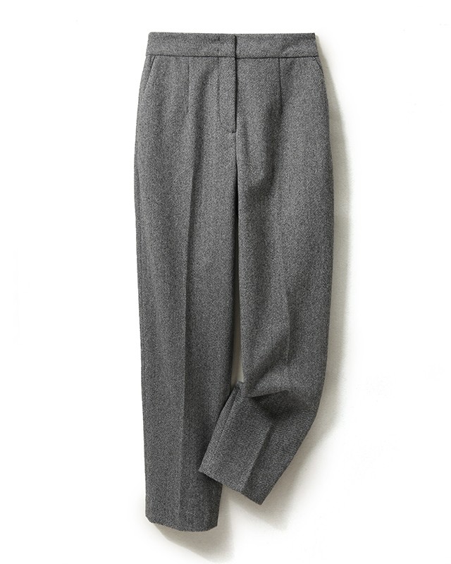 烟管裤又称为锥形裤,它的裤型从上往下越来越窄,烟管裤的设计非常的干练,是阔腿裤和小脚裤的完美结合体,能完美的遮挡胯宽,屁股大、O型腿的问题。裤长建议选择九分的设计,不但能露出纤细的脚裸,还能从视觉上拉长腿部线条,搭配羊绒大衣干净利落,不但能凸显自身的气场,还显得特别的高挑。