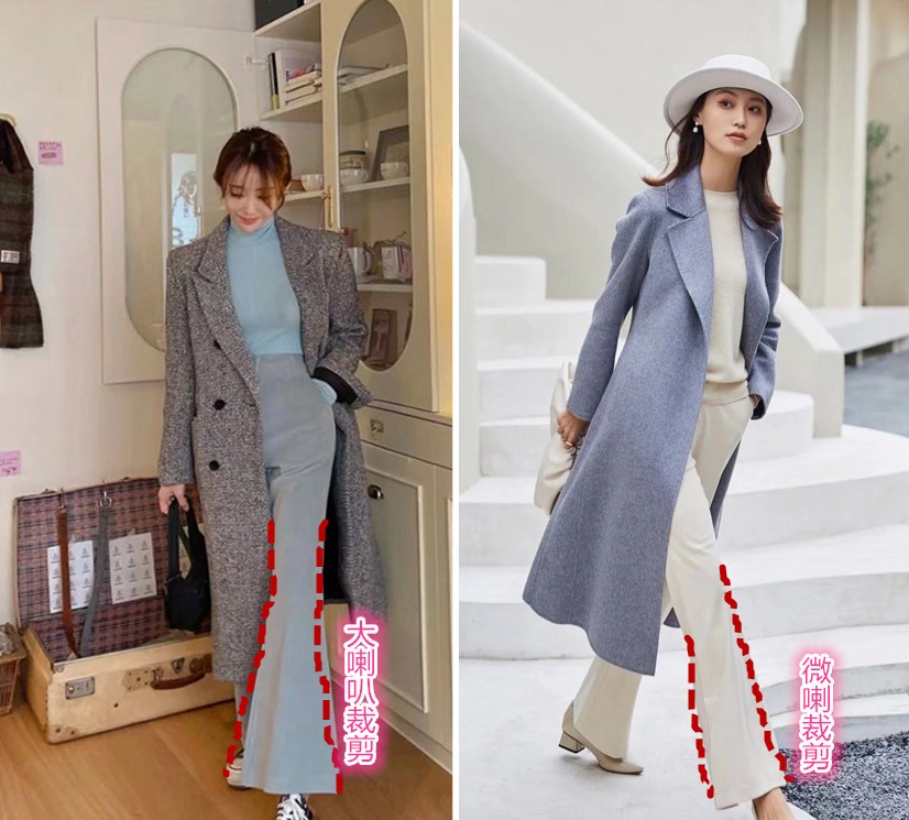 如果单纯只是小腿粗的人,大腿一般会比较纤细,那么选择能凸显大腿细的喇叭裤是再合适不过的了。喇叭裤不仅是改善小腿粗问题的一把好手,还是打造法式复古风的必备神器,比起及地的长度,九分裤长的喇叭裤更适合日常私服穿搭,而且比较好驾驭。和羊绒大衣搭配起来,既摩登又复古,妥妥的时髦精一枚。
