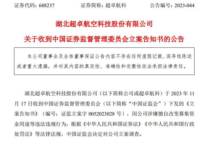 上海超卓公章、法人章的审批使用登记流程及银行U盾的保管使用均存在不规范情形,也引起了监管的高度重视。11月17日,超卓航科收到证监会下发的《立案告知书》,因公司涉嫌擅自改变募集资金用途等违法违规行为,证监会决定对公司立案调查。