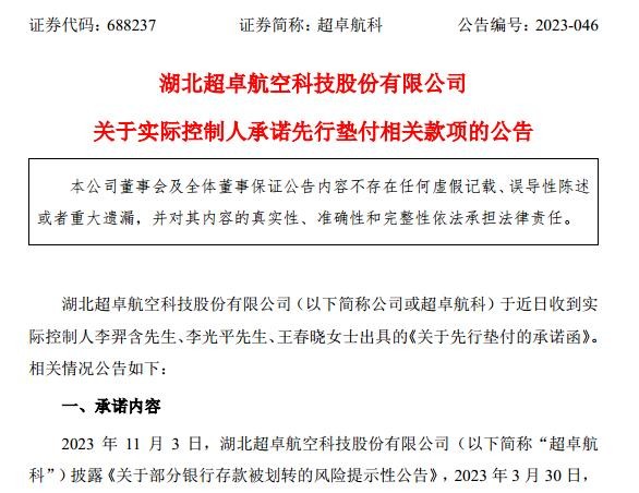 值得一提的是,11月17日,超卓航科发布了一则关于实控人承诺先行垫付相关款项的公告。公告显示,由于本次事项已进入公安机关的侦查程序,预计后续案件侦破、款项追回仍需要较长时间。为了更好地维护超卓航科和广大投资者的利益,公司实控人作出承诺,将积极筹集资金先行垫付上海超卓被划走的5995万元存款,并协同超卓航科、上海超卓共同追索前述款项,积极采取各项措施全力维护超卓航科及广大投资者的利益。