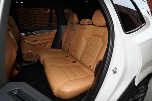 车身线条简洁流畅,展现出了中大型SUV应有的威严气势;车窗上方采用镀铬饰条划出一道优雅的弧形,宽大的轮眉奠定了新车的越野属性;配备了车顶行李架、后排隐私玻璃、隐藏式门把手和20英寸铝合金轮毂。贯穿式尾灯组是值得瞩目的设计,内部采用大量LED灯组模块进行排列,连带logo标识一同点亮;而两侧却进行回旋镖造型的边缘收敛,配合大面积黑色扩散器加持的包围结构和双边共四出排气布局,为新车增添了几分霸气和运动感。新车尺寸分别为5042x1977x1780mm,轴距为2984mm。