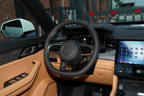 车内的整体设计将豪华质感和科技氛围进行了整合,在表达时尚感的同时,又不失大气沉稳;中控台多层次的设计中央加入了蚀刻真铝饰板进行点缀,表面还加入了数字科技感的纹理,看起来十分精致。车内大量采用真皮材质包裹,触手所及之处皆是柔软和细腻,尽显豪华。三辐式平底真皮方向盘带有电动记忆/加热功能,粗细适中,握感舒适;锥子型的电子挡杆阻尼优雅,换挡干脆;配备了12.3英寸仪表盘和12.8英寸全彩W-HUD抬头显示,能够提供清晰丰富的行车信息,驾驶中不用频繁低头即可了解关键数据,安全性更高。12英寸车机屏幕,下方的物理调节按键也进行了取消,以一块6英寸触控显示屏取代,两侧还配备了1.4英寸旋钮,内部同样配以小屏幕,科技感满满。搭载了LYNK OS智能系统,匹配高通骁龙8155芯片,屏幕画面显示清晰,色彩饱和度高,UI界面采用卡片式设计清晰地展示了各类功能模块,便于查找,易于上手;运行起来丝滑流畅无卡顿,多任务处理也能轻松响应。