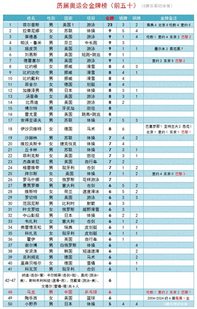 巴黎奥运会落幕了,历届奥运会金牌榜也再一次刷新,其中,美国游泳动员莱德基、德雷塞尔,德国马术运动员伊沙贝尔·维特,美国体操运动员拜尔斯,中国乒乓球运动员马龙,美国女篮运动员陶乐西,由于在巴黎奥运会有金牌入账,也进入到前50名。马龙排名第48位。