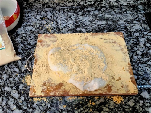 糯米团倒在熟黄豆粉上,裹一圈粉