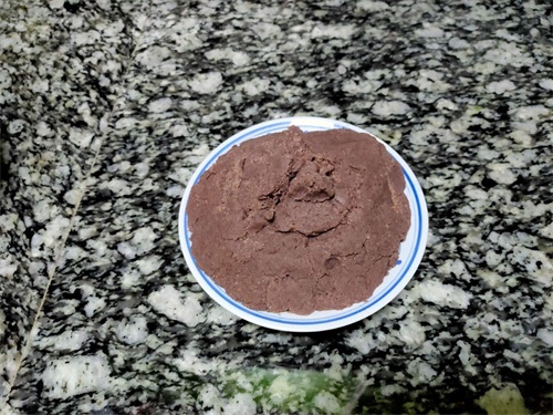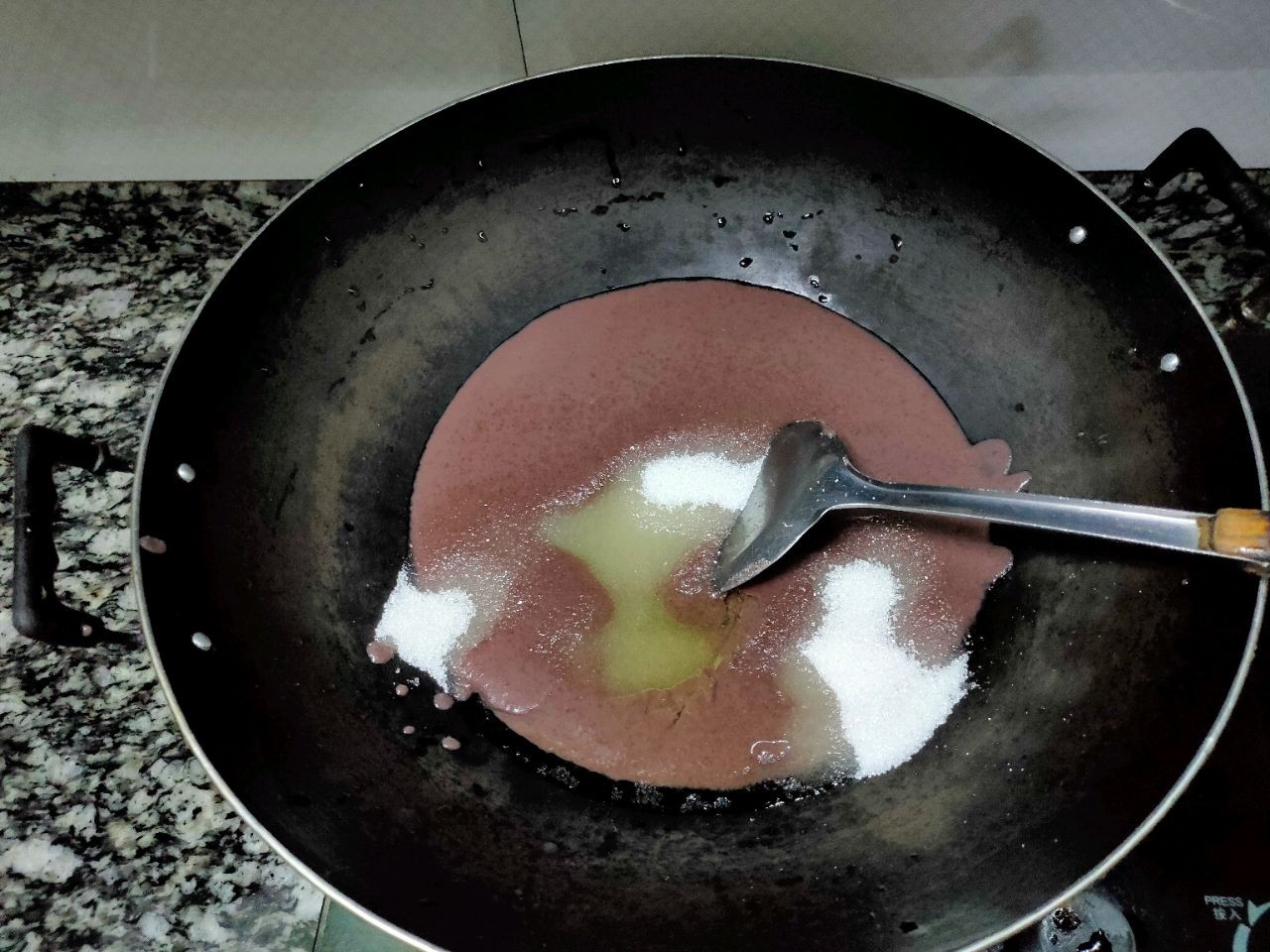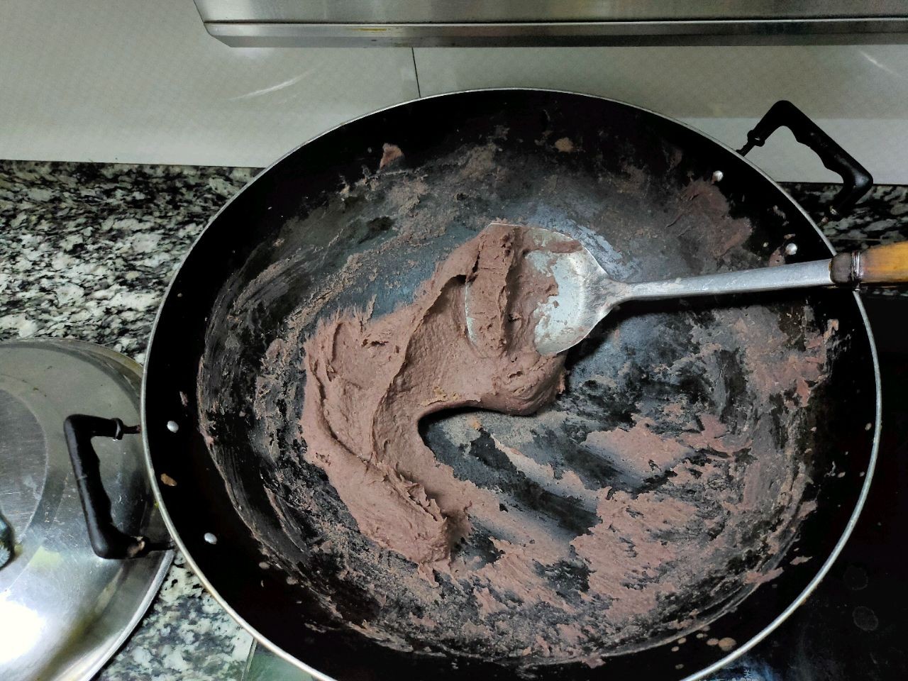 将红豆浆、白砂糖、玉米油,倒进锅中,小火慢熬,不停搅拌