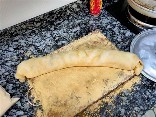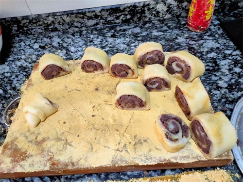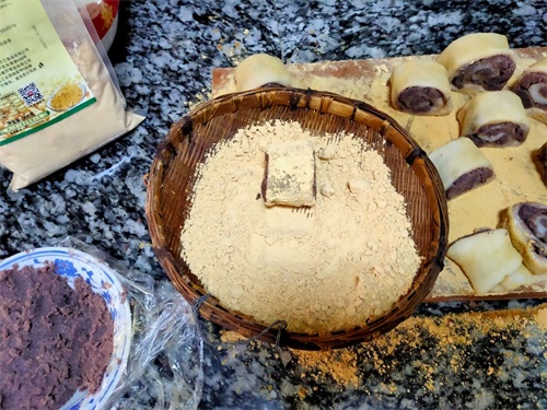 没有红豆沙的那一面,裹上一圈熟黄豆粉即可