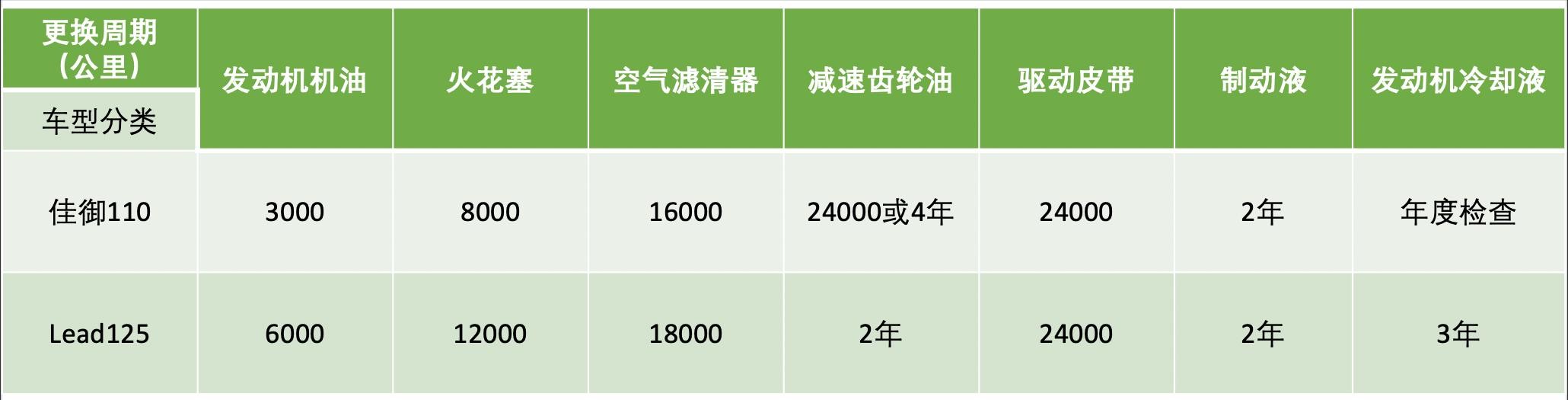 Lead125更换机油周期最长是6000公里,而佳御是3000公里。Lead125火花塞更换周期是12000公里,而佳御是8000公里。Lead125在三年后需要更换冷却液,而佳御只需要年度检查。两车的油耗都是小于或等于2.5L每一百公里。Lead125最高时速为93km/h,佳御是85km/h。Lead125尺寸为1850X680X1130mm,轴距1273mm;佳御为1835X670X1125mm,轴距1265mm。Lead125离地间隙140mm,而佳御是116mm,底盘更低。Lead125整备质量是116kg,而佳御是115kg。两者油箱都为6L。