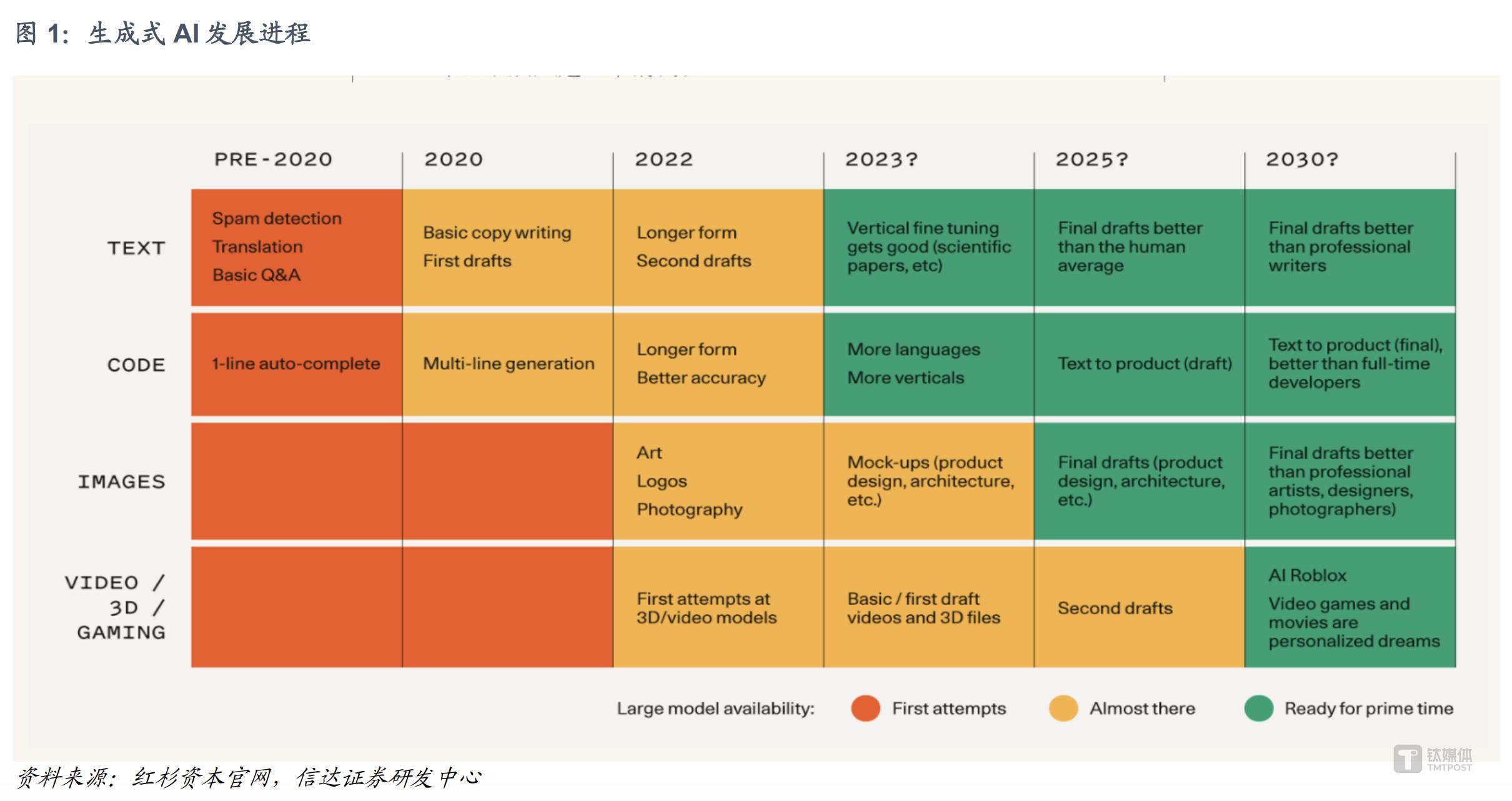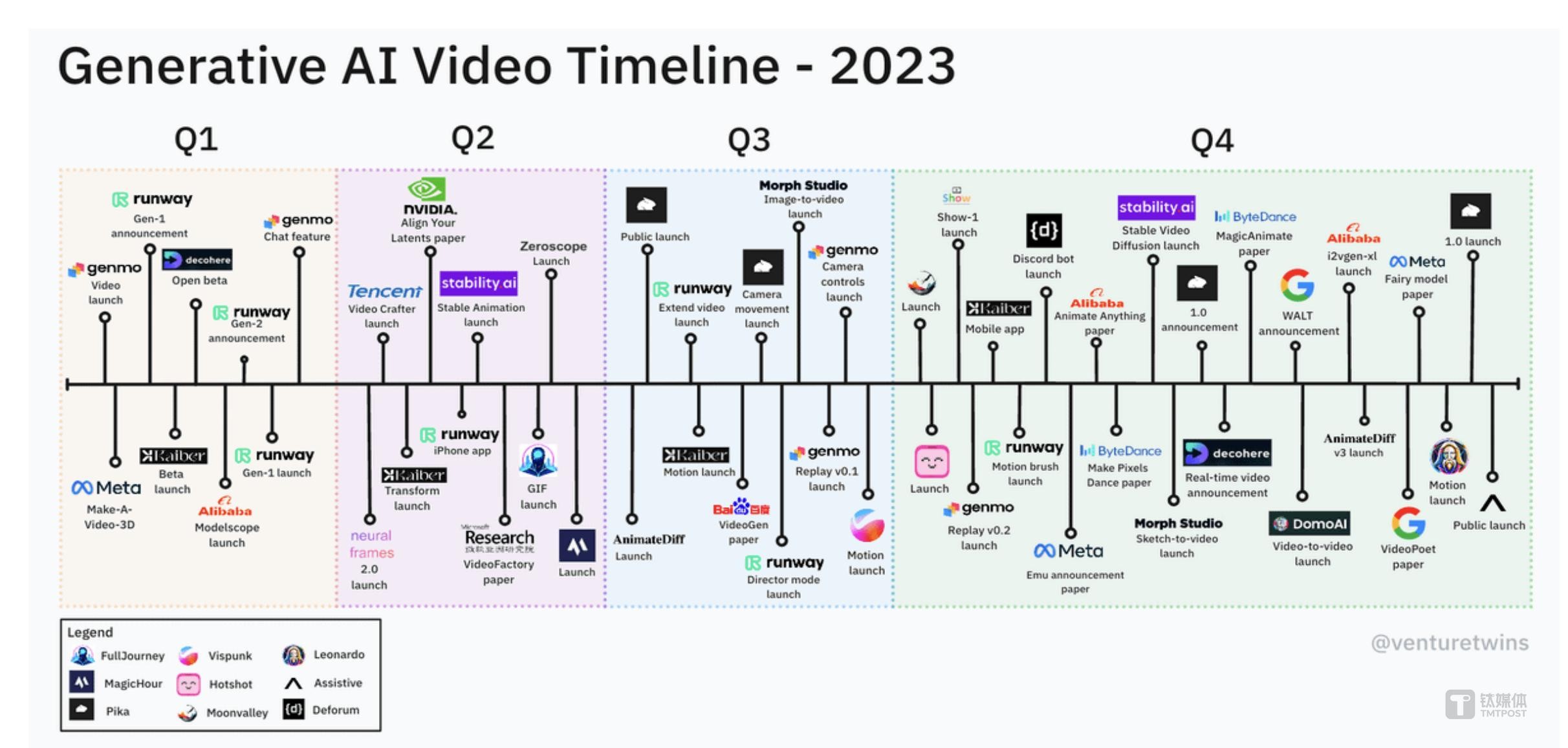 事实上,红杉资本2023年发布的一篇关于生成式 AI 发展进程的预测报告中表明,在历经文生文、文生图的升级迭代后,底层大模型技术迭代放缓,因此,视频方向将是 AI 领域需要重点关注的方向之一,因为视频杂糅了文本、语音、图像等多维度内容,有更多的想象空间。