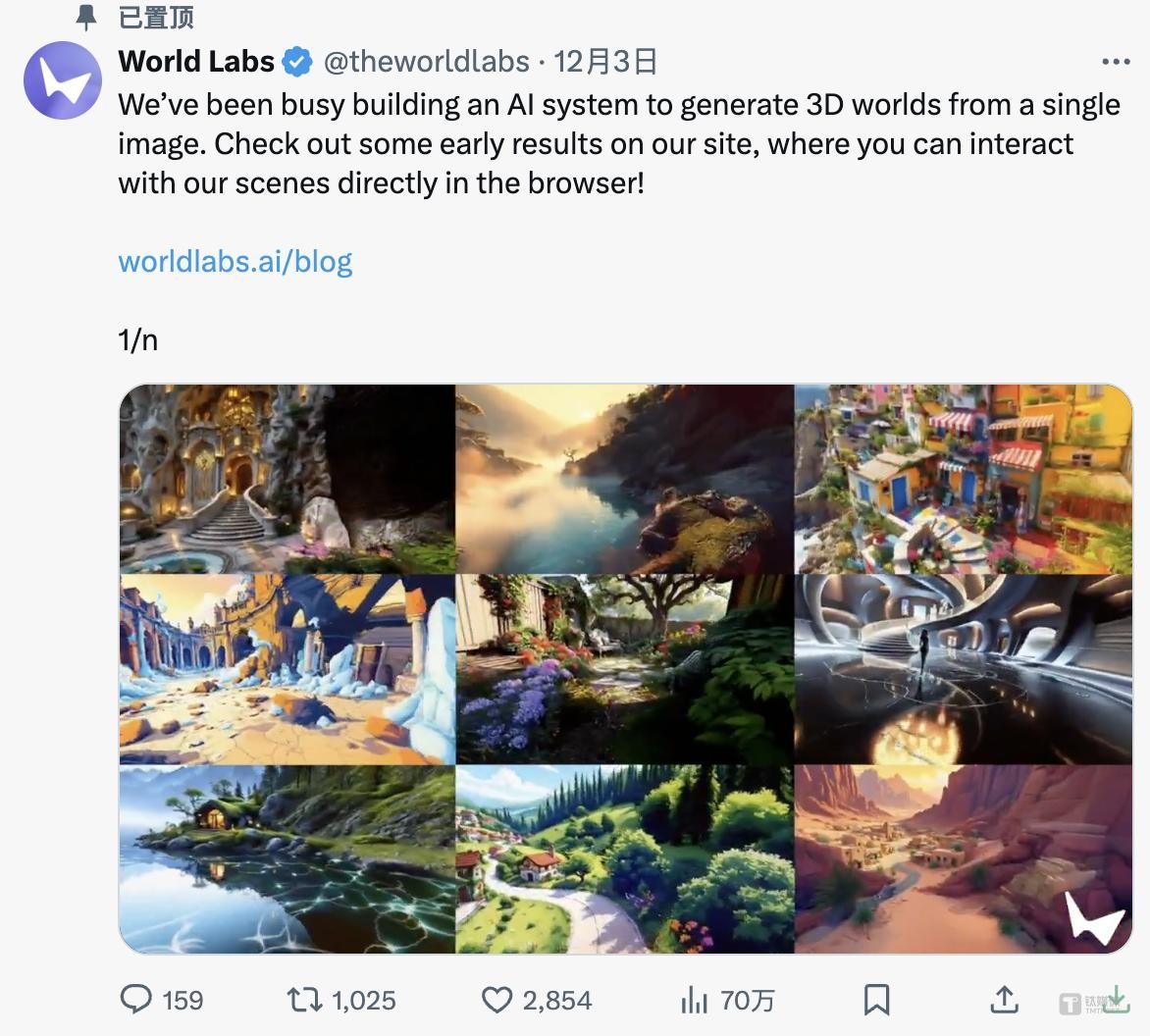 此外,作为AI领域影响力最大的女性华人之一,斯坦福大学教授李飞飞于当地时间12月2日公布了其首个创业项目World Labs的成果——能用单张静态图片生成3D世界的AI产品。