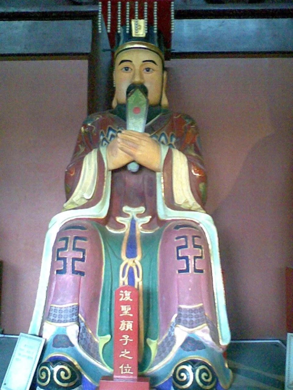 孔子说:“贤者,回也”。自三国.魏正始元年祭孔时以颜回子渊为配享后,历代追封有加,如亚圣、亚圣衮国公、衮国复圣公、复圣等。孔庙配颜回子渊塑像如下: