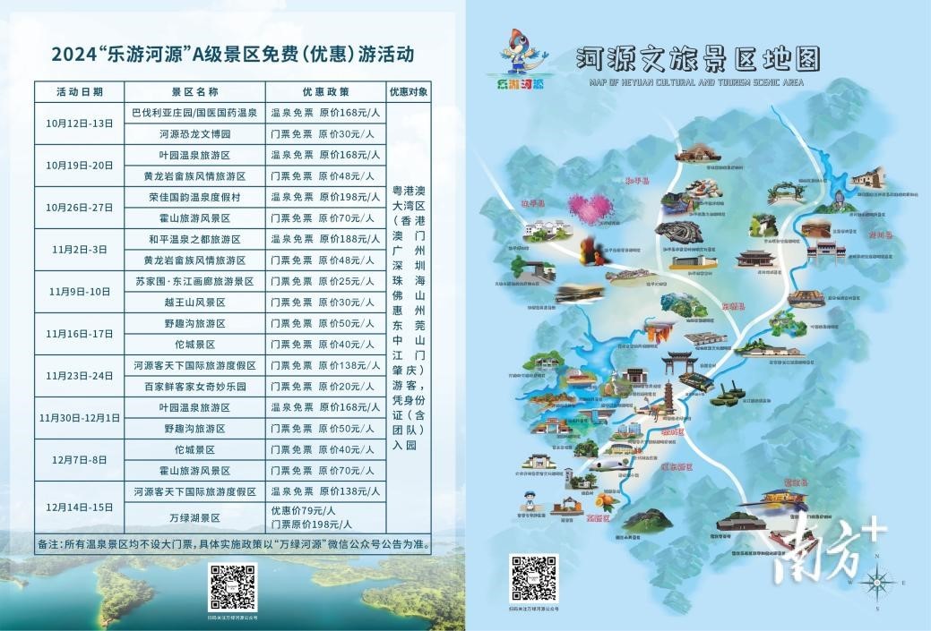 9月,河源发布2024“乐游河源”A级景区免费(优惠)游活动。10月12日-12月15日,河源每周末精选2个景区,面向香港、澳门、广州、深圳、珠海、佛山、惠州、东莞、中山、江门、肇庆等粤港澳大湾区11个城市居民推出“乐游河源”免费游活动。