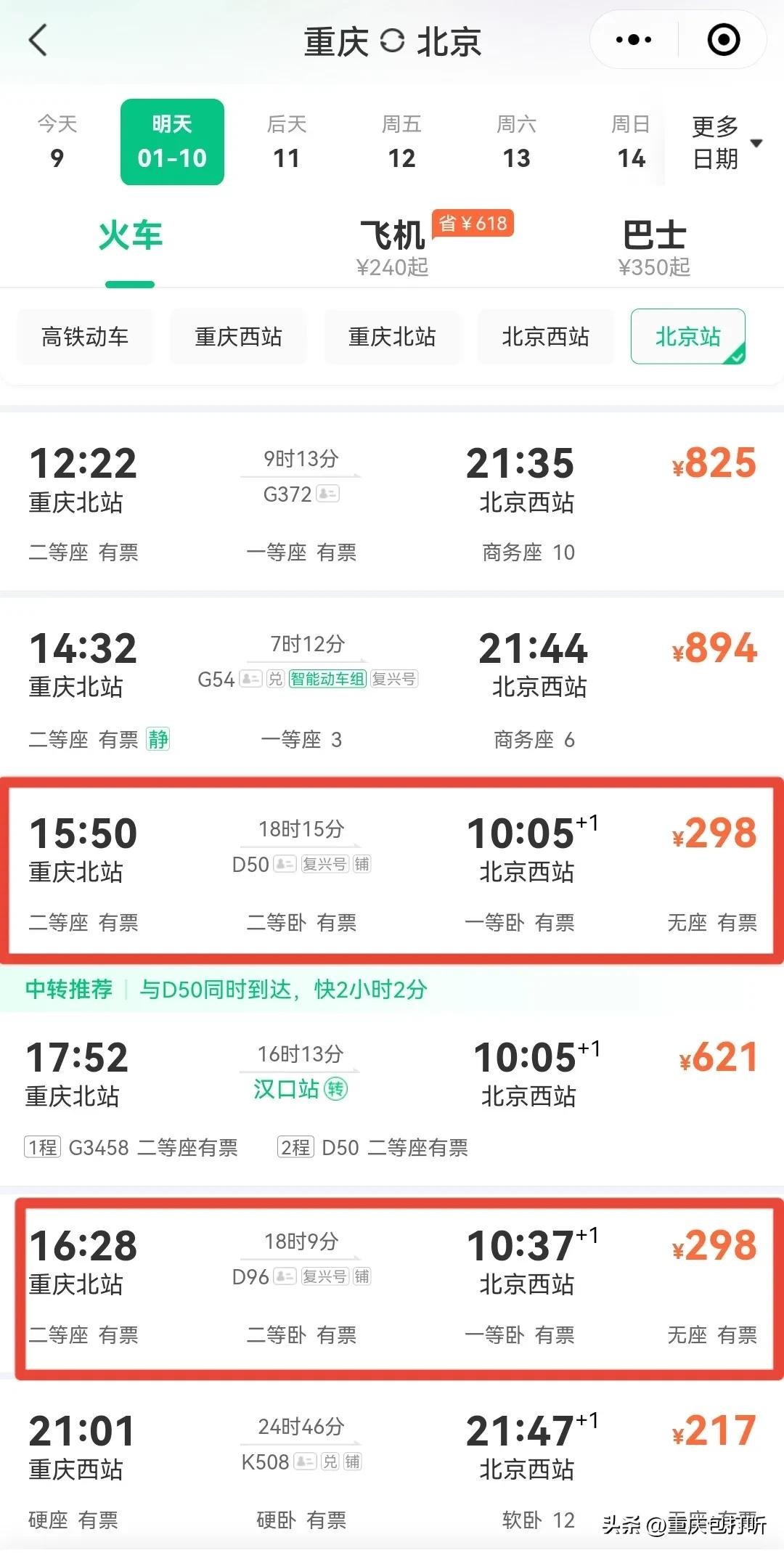 最大变动是重庆至北京新增动车组两对,分别是D50和D96,总用时都超过18小时,并且是通宵在夜间行驶,费用和原来直快列车一样,比高铁G字头几乎便宜三分之二。