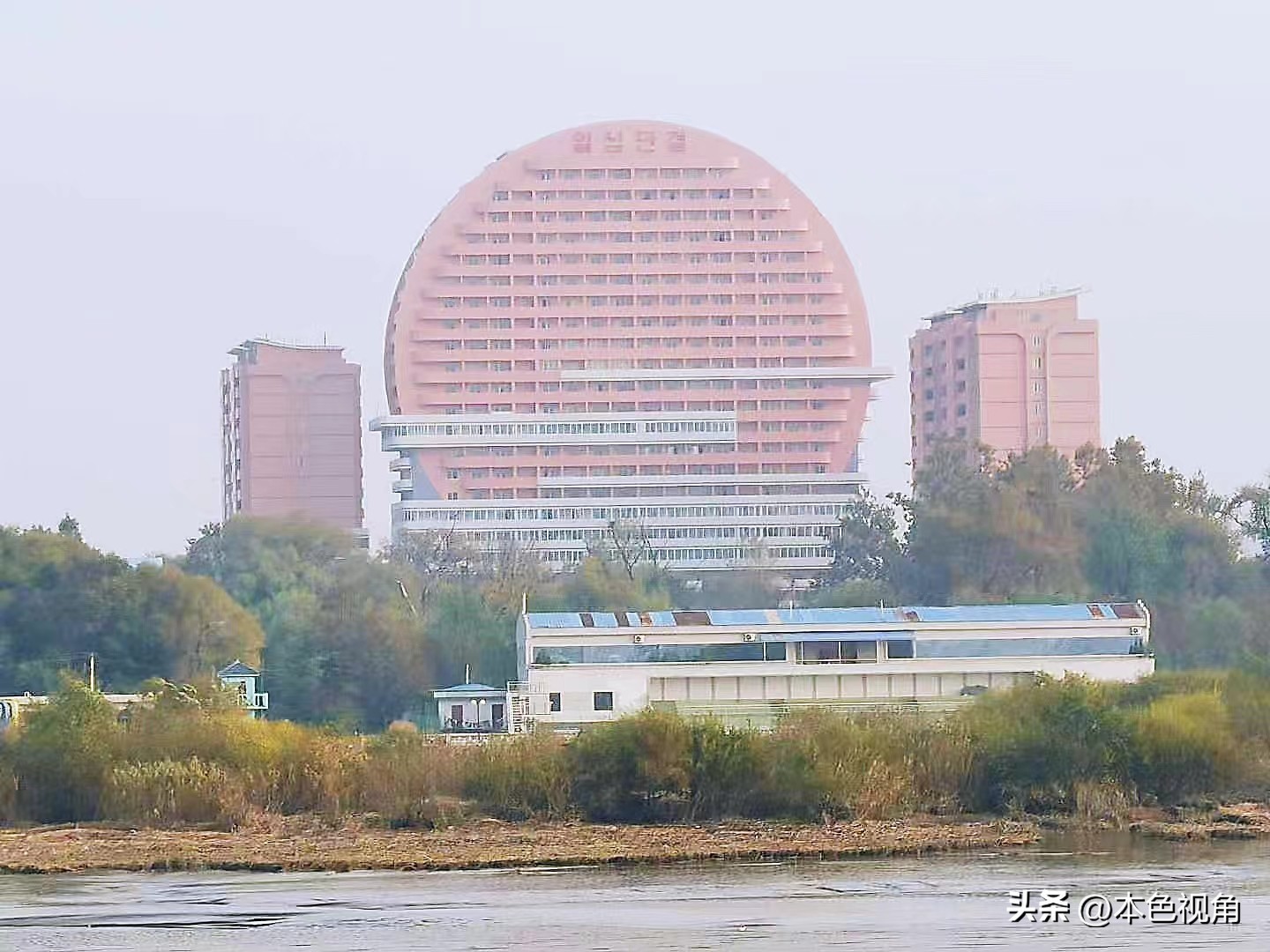 除了鸭绿江大桥,还有在丹东鸭绿江畔,可以远眺朝鲜新义州的景致,其中这栋造型像太阳的建筑尤为显眼。
