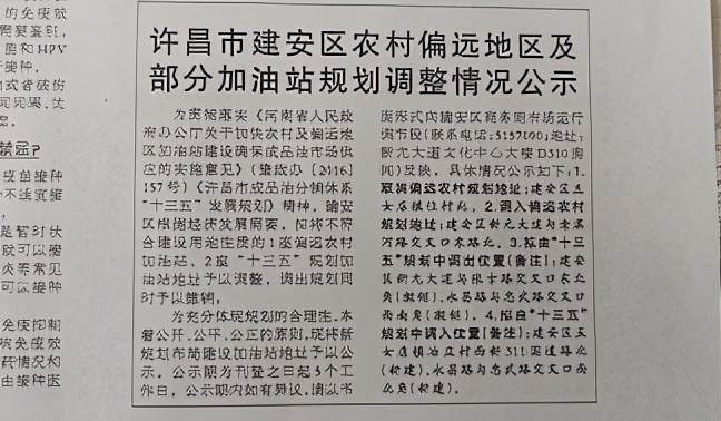 许昌市建安区农村偏远地区及部分加油站规划调整情况公示