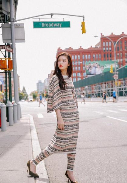 青花瓷配色的裙装,真是眼前一亮,清新脱俗,生动不失时尚品味。短靴佩戴,在视觉的感官下,呼应服装色彩,使整体更加协调。