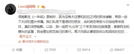 小编这里先给大家解释下他道歉的是什么事情。由于最近一直颇受各大媒体和网友关注的性侵事件,在网上引发了"trigger warning",女童以及女性保护这件事被大家开始重视起来。就在这个敏感的时期,有网友扒出来了刘润难疑似"咸猪手"",袭胸虞书欣的照片。