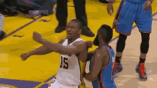 2009年赛季结束后阿泰前往湖人,并于次年随队获得了总冠军。当然了,像这种联盟影响力不太大的球队流浪儿,也没人说他像后来的杜兰特“投敌”或者凯尔特人三巨头“抱团”。最有意思的是在2012年和俄克拉荷马雷霆队季后赛的过程中,这位大哥竟然对哈登恶意犯规来了一次暴力“肘击”,使得当年雷霆队的第六人立刻因为脑震荡歇菜了,据说当时阿泰也因为此事被禁赛八场。