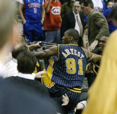 2002年2月——2006年1月,阿泰因为球队交易前往印第安纳步行者打球。这几年的步行者阵容还是不错的,只要好好打本应该能有冲击总决赛的实力。可惜的是2004年赛季刚开始在和“底特律活塞”的一场比赛中,阿泰和对方中锋本-华莱士发生了剧烈的身体碰撞产生冲突,随后被工作人员隔开。此后有挑事儿的球迷对着球员一顿嘲讽,性格暴躁的阿泰上去就对此球迷一顿王八拳军体操进行疯狂输出,随后队友纷纷跟上和场边球迷进行了互殴。这就是NBA史上最恶劣的群殴事件——“奥本山宫斗殴事件”。在此事件中,步行者参与斗殴的球员都进行了严格的禁赛处理,此事件也对NBA的公众形象大受影响。以前球队比赛虽然身体对抗非常激烈,但是这次事件球员竟然对“衣食父母”球迷们进行了互殴。阿泰也因为此事禁赛82场,基本上一个赛季都无法参加比赛了;而步行者由于多名主力球员也参与到了斗殴,也不同程度的收到了禁赛处罚,导致球队即战力大损战绩下降,对季后赛的竞争实力也大幅度受挫。