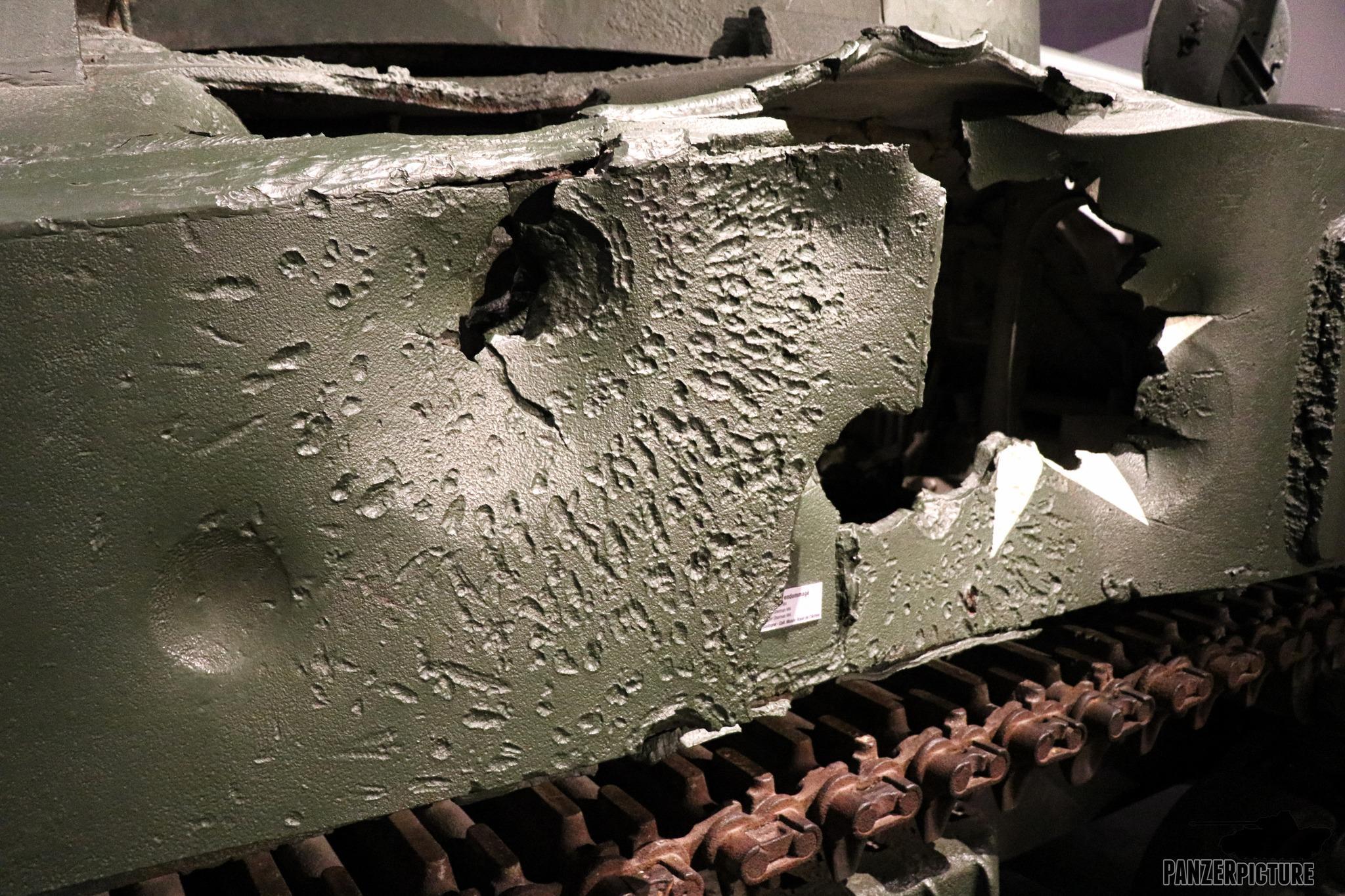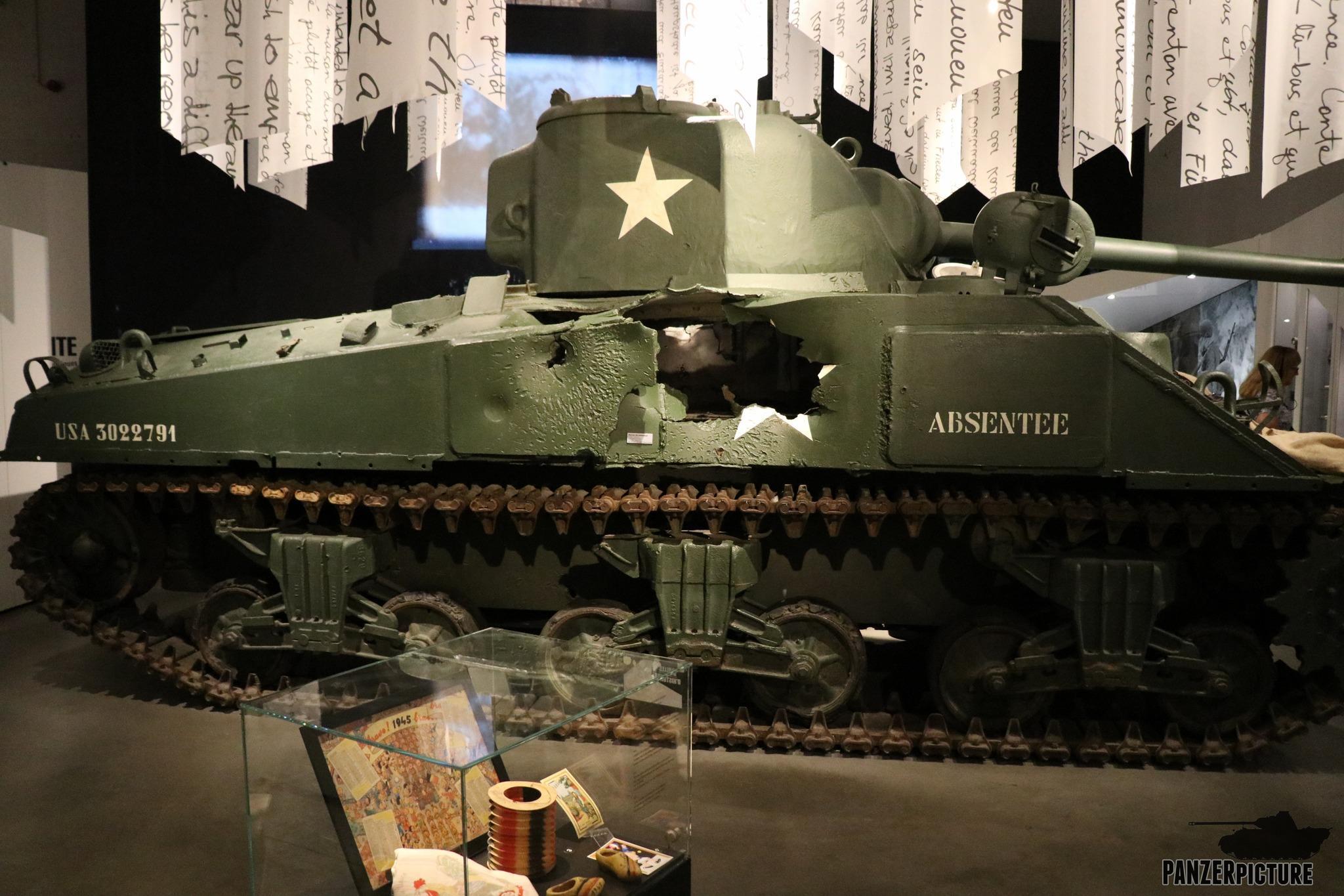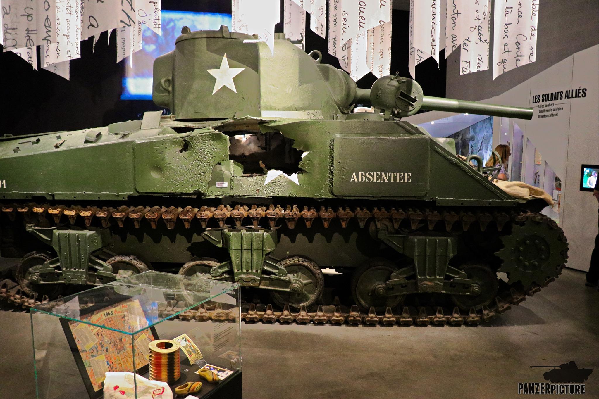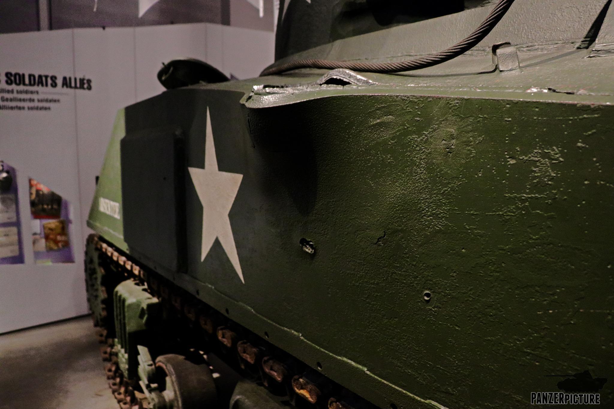 这个M4谢尔曼被误导表示为二战车辆。这辆车实际上是一辆战后坦克,车体来自比利时用作靶场目标,你看到的受损都是在靶场上完成的。