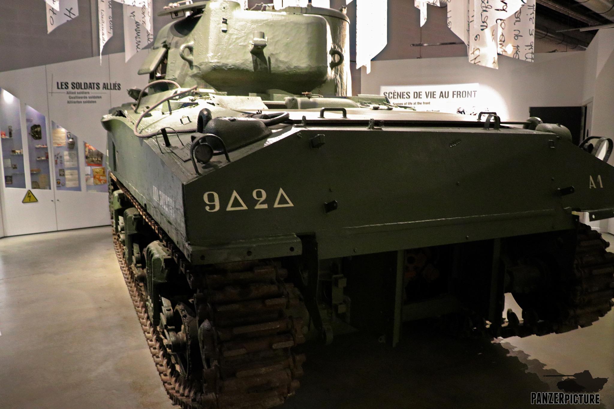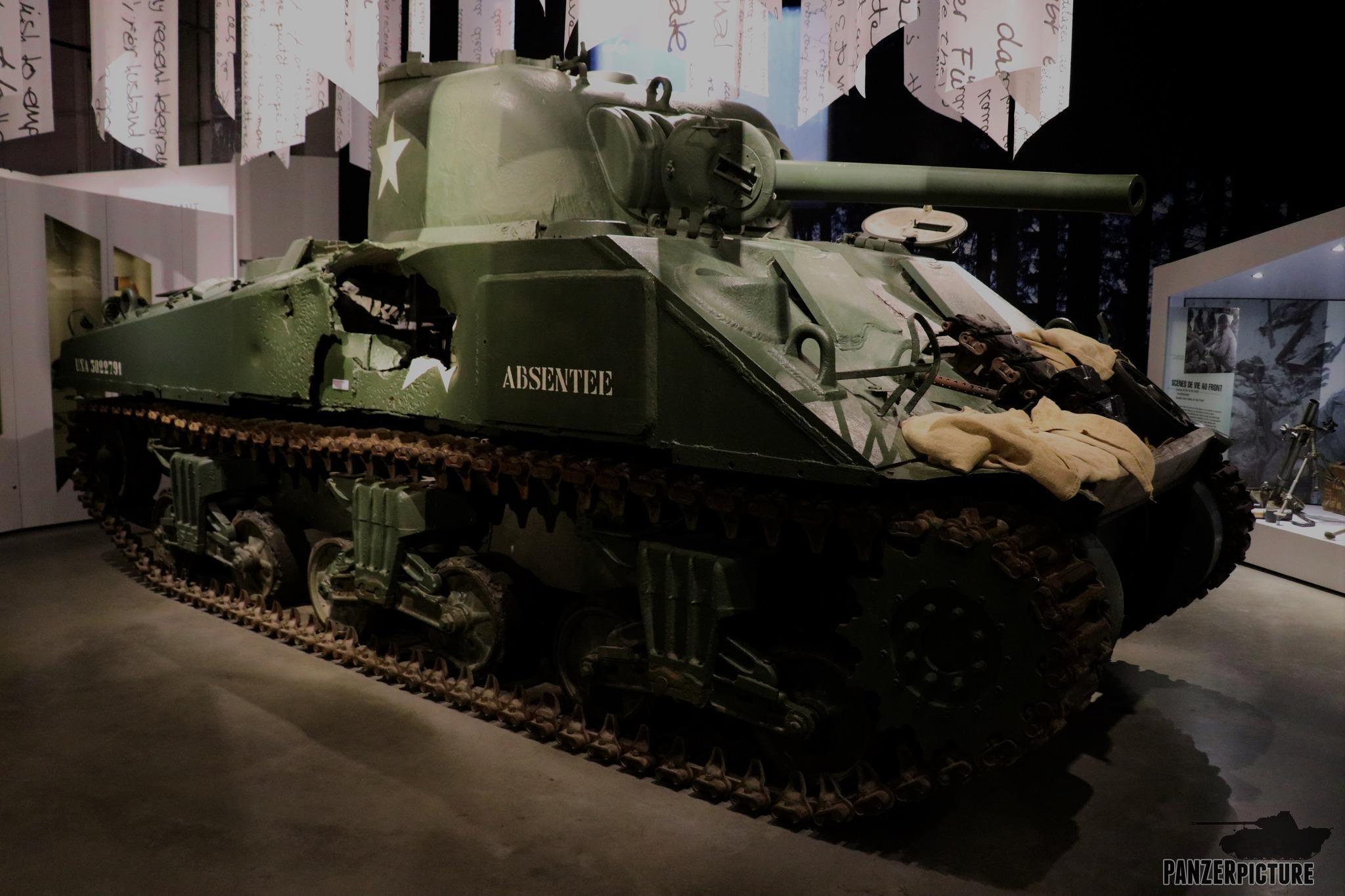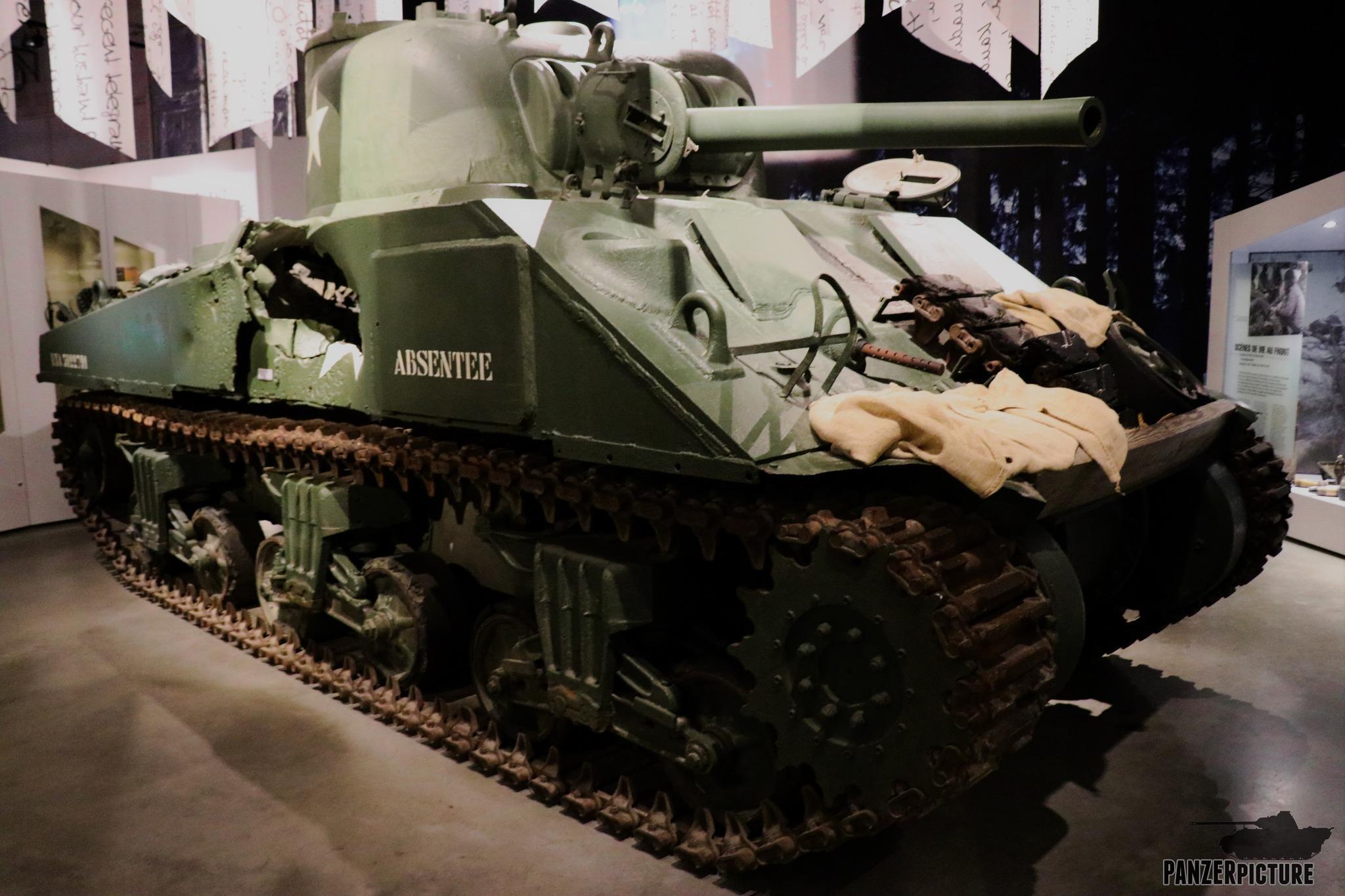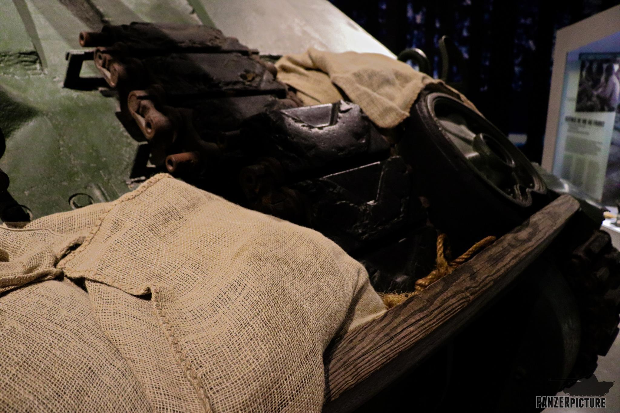 这个M4谢尔曼被误导表示为二战车辆。这辆车实际上是一辆战后坦克,车体来自比利时用作靶场目标,你看到的受损都是在靶场上完成的。